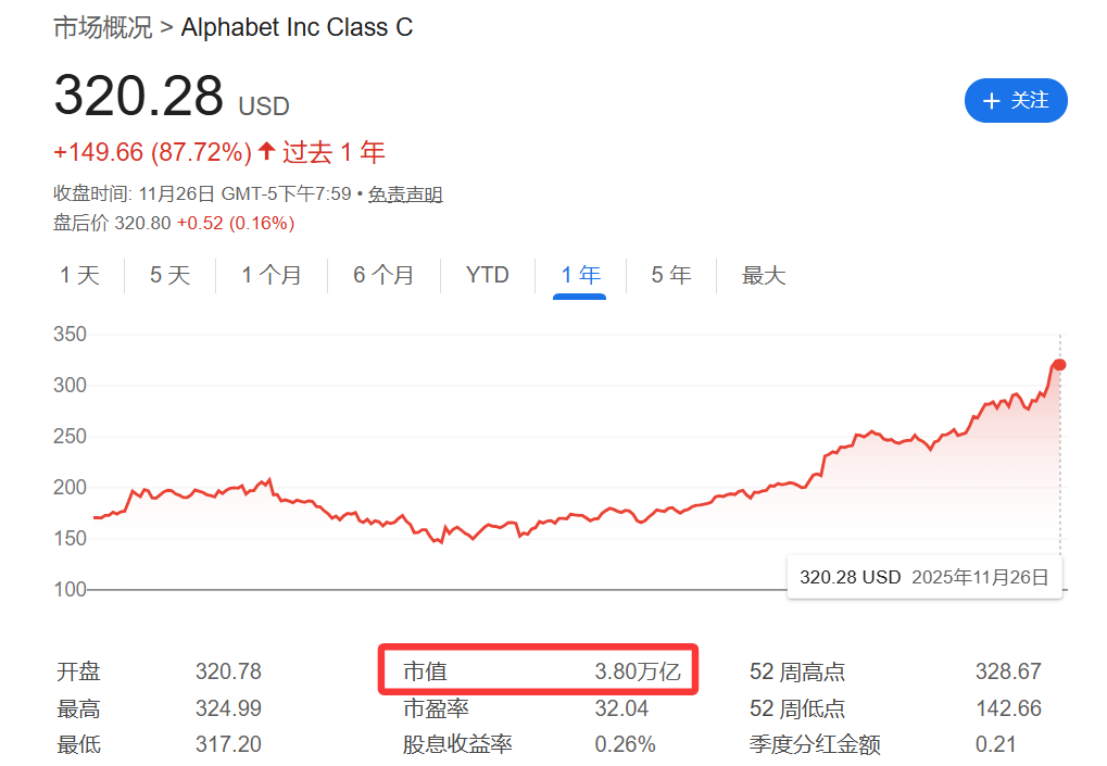 股价表现:AI动能助推市值逼近4万亿除了芯片领域的兴奋点外,Alphabet在AI模型层面的进展也为其股价提供了持续动能。本月早些时候发布的Gemini 3模型被市场普遍认为取得了巨大成功,使Alphabet的大语言模型成为OpenAI旗下ChatGPT的有力竞争对手。
